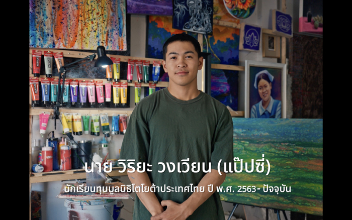 นักศึกษาศิลปกรรมศาสตร์ผู้ใช้ความสามารถด้านศิลปะสร้างคุณค่าให้กับสังคม เงินทุนการศึกษากลายเป็นแรงผลักดันให้เขาได้พัฒนางานศิลปะของตนเอง พร้อมนำทักษะและจินตนาการไปทำกิจกรรมจิตอาสา สร้างสรรค์งานศิลป์ให้กับชุมชนและโรงเรียน