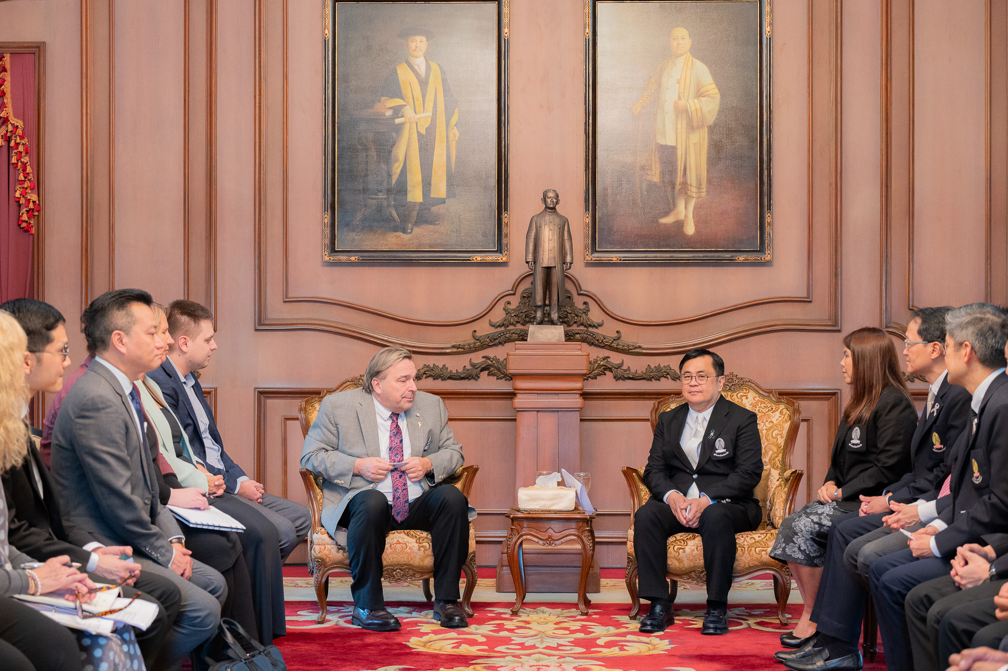 ศ.ดร.วิเลิศ ภูริวัชร อธิการบดีจุฬาลงกรณ์มหาวิทยาลัยให้การต้อนรับคณะผู้แทนจากประเทศแคนาดา นำโดย The Honourable Ken Cheveldayoff, Minister of Advanced Education, Government of Saskatchewan พร้อมด้วยผู้บริหารระดับสูงจาก the Government of Saskatchewan ผู้แทนจาก University of Saskatchewan และ Saskatchewan Polytechnic ตลอดจนเจ้าหน้าที่จากสถานเอกอัครราชทูตแคนาดาประจำประเทศไทย เมื่อวันที่ 27 กุมภาพันธ์ 2569 ณ ห้องรับรอง ชั้น 2 อาคารจามจุรี 4