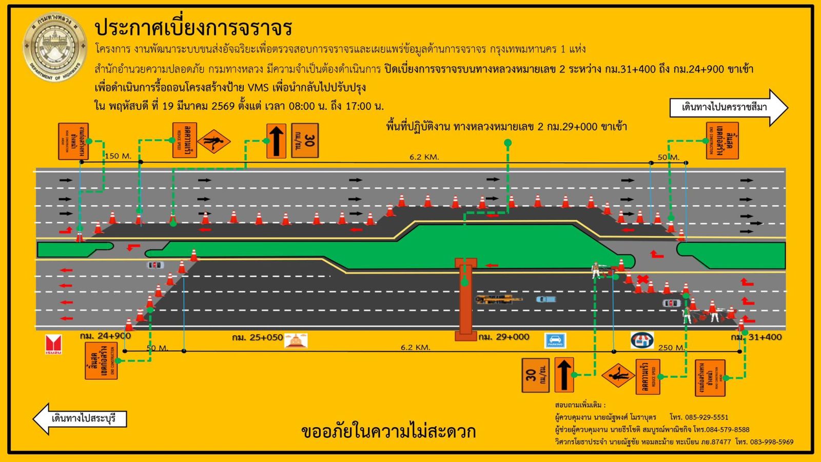 ในวันที่ 19 มีนาคม 2569 เจ้าหน้าที่จะดำเนินการปิดทางเดินรถบนถนนมิตรภาพ ขาเข้า กทม. เนื่องจากมีการรื้อถอนป้ายไฟ บริเวณ กม.29 ก่อนถึงค่ายลูกเสือเพชรรัตน์ ซึ่งจะทำการปิดทางเดินรถ 100% โดยจะทำการเปิดช่องทางพิเศษใน ขาออก-กทม. จำนวน 1 ช่องทาง